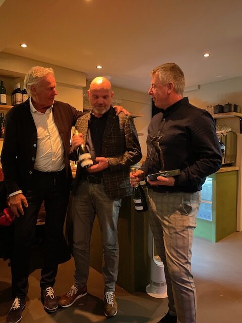 Corwin gaat met de hoofdprijs naar huis, en die twee met die witte vetertjes met de troostprijs. Het was weer ee memorabel jaar mannen, zowel op als naast de baan. Mooie banen gelopen, en wat leuk is: ondanks het gemopper over de afstand, volgend jaar gaan we weer naar Sybrook bij beter weer. Want het blijkt wel een hele mooie baan. Ook de zomertour onder leiding van Leen was weer van grote klasse, wel even wennen aan de nieuwe, batterij gedreven vervoers technologie. Naast de baan moeten we het even doen met de plasproblemen van het hoofd van de sjoemel commissie, Jacob die het weer op zijn heupen krijgt en Albrecht die voor zowel een persoonlijke als voor een vliegtuig motor revisie gaat. Hij gaat piepen en kraken in de groep maar dat maakt ons nog strijdbaarder om dat klere beeldje bij Corwin uit het raamkozijn te golfen. KOM OP MANNEN, WE GEVEN VOL-GAS VOLGEND JAAR.