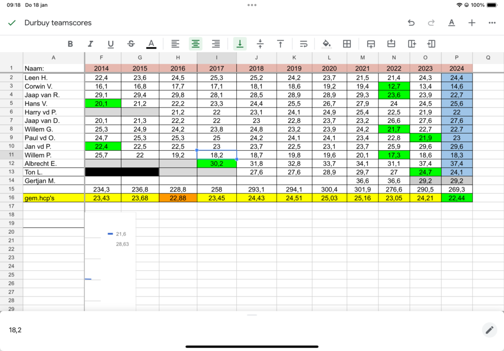 En zo zie bijvoorbeeld bij de blz HCP dat de laagste gemiddelde HCP van alle spelers 22.88 was MAAR……….. dat we (als de nieuwe hcp’s gecontroleerd zijn en kloppen) we dit jaar met de laagste stand ooit beginnen 22.44. Iedereen die onder deze stand presteert, hartelijk dank. De anderen die er (nog) boven zitten, KOM OP MANNEN.
