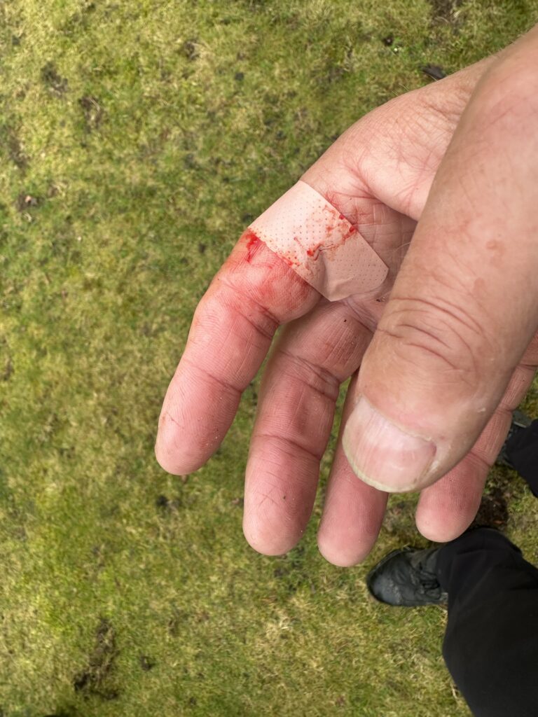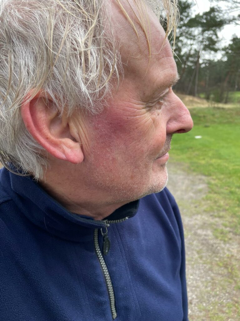 Na een kop snert en een biertje, kunnen we de baan weer in en ik ben klaar om de inhaal race te starten. Mijn clubs echter niet, die blijven, hoe goed ik ook stuur, de bal de verkeerde kant op bewegen. Op hole 10 is de afslag soepnaam waardig, SNERT. Dan probeer ik te corrigeren met een harde slag die, hoe krijg je het voor elkaar, mijn rechter wijsvinger open haalt. Die begint te bloeden als een rund. Gelukkig heb ik pleisters bij me maar bij elke slag drupt het bloed onder de pleister vandaan. Het spel wordt er allemaal niet beter van maar we moeten door. De paraplu zet ik tijdens de buien al niet meer op, het wordt er allemaal niet beter van. Op hole 14 slaat Paul zijn derde bal in het kreupelhout en zoekt een mogelijkheid om hem hieruit te krijgen. De andere flight spelers zien de karren van de voorgaande flight nog naast de green staan en lopen er naartoe om te vragen waarom ze niet weggaan. Juist op het moment dat we zien wat er aan de hand is heeft Paul een oplossing gevonden voor zijn bal in het kreupelhout. Een ferme pitch slag moet hem eruit werken richting green. Ik stond echter precies in die balvlucht geparkeerd en kreeg de bal vol op mijn kannis. Het is wel even een gewaarwording moet ik zeggen. Paul verontschuldigt zich vele malen maar het is natuurlijk mijn eigen schuld. Regels in veiligheid op de golfbaan worden bij het GVD examen al afgenomen, dus……. Later in het clubhuis loop ik naar het toilet om mij even op te frissen. Komt een andere speler binnen en vraagt: “zo, lekker gespeeld?” Nou zeg ik, ik heb 6 strepen op mijn kaart, mijn vinger tot bloedens open gehaald en een bal in mijn smoel gekregen. “Nou, prettige dag nog verder” zei hij en beende het toilet uit. Volgens mij kan het vanaf nu alleen maar beter gaan 😨